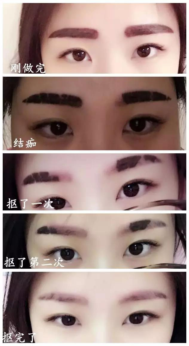 手痒了,把结痂的痂皮扣掉,接下来就悲剧了!看上面的图片就知道,把痂皮扣掉后,定妆眉和美瞳线的颜色淡了很多,这下妹子们又要担心自己做的半永久会不会不上色。