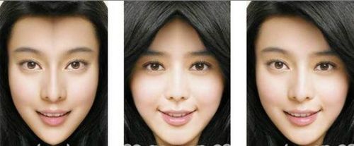 看下其他美女的对比图。中间的是正常脸,左右两边各是复制了左右脸后合成的图片。是不是觉得中间的那张脸,虽然五官没有对称,但是看起来却和谐多了?