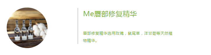 Me唇部修复精华中富含的玫瑰、洋甘菊等天然植物精华,还特别添加bFGF、VEGF两大修复因子,让唇部滋润饱满有弹性,唇色鲜艳透亮。